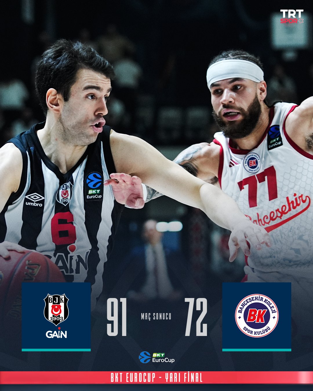 🏀 BKT EuroCup yarı finalinde 🇹🇷temsilcilerimizi karşı karşıya getiren maçta Beşiktaş GAİN, Bahçeşehir Koleji'ni 91-72 mağlup ederek seride 1-0 öne geçti. 🔝 Jonah Mathews - 21 Sayı