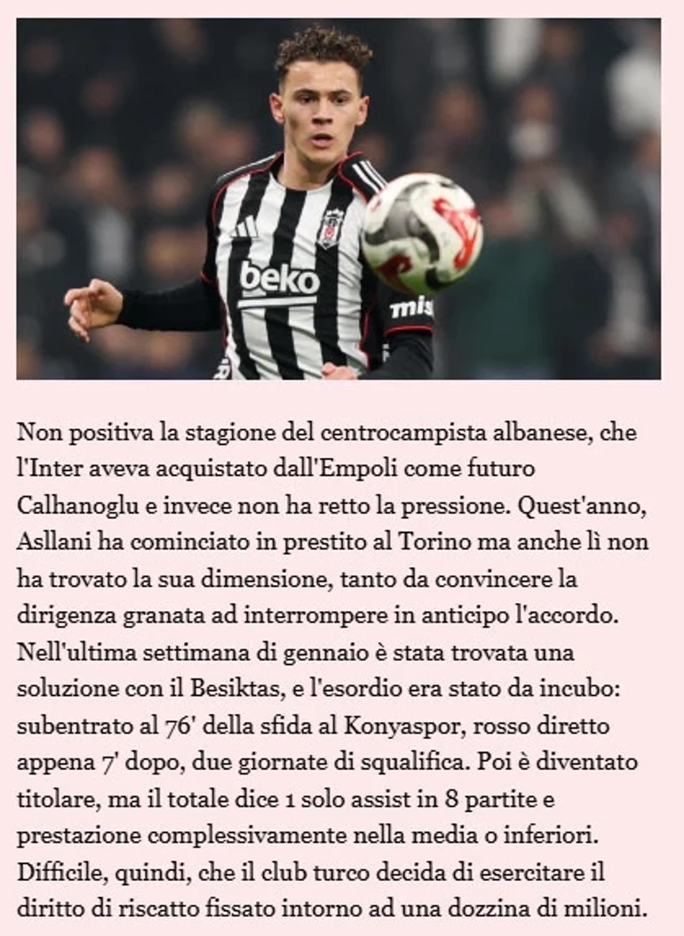 ![]() Beşiktaş'ın kiralık kadrosuna kattığı isim için İtalyan basını, geleceğine ilişkin kararı duyurdu. Beşiktaş, ara transfer sezonunda yapılanmaya gidecek kadrosunu yenilemişti. Agbadou, Oh, Asllani, Murillo gibi önemli silahlara imza attıran siyah beyazlılarda ayrılacak ilk isim belli oldu. ![]() Ocak ayında Beşiktaş'ta çözüm buldu. İlk maçı kabus gibiydi. Konyaspor maçının 76. dakikasında oyuna girdi ve yedi dakika sonra kırmızı kart görerek iki maçlık ceza aldı. Daha sonra ilk 11'de oynamaya başladı ancak sekiz maçta sadece bir asist yaptı ve genel performansı ortalama veya ortalamanın altında kaldı. Bu nedenle, Türk kulübünün yaklaşık on milyon euro olarak tahmin edilen satın alma opsiyonunu kullanması pek olası görünmüyor." Fanatik
