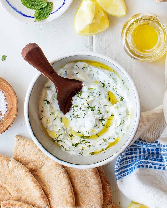 ![]() Malzemeler 3 su bardağı süzme yoğurt 2 adet orta boy salatalık 3 diş sarımsak 4 yemek kaşığı zeytinyağı 1 çorba kaşığı üzüm sirkesi 1-2 çay kaşığı tuz 1 tatlı kaşığı kuru nane Yunan cacığı (tzatziki) nasıl yapılır? 1. Yoğurdu derin bir kaseye alın. 2. Sarımsakları rendeleyerek ya da döverek yoğurda katın. 3. Sirke, zeytinyağı ve tuzu da yoğurda katarak yoğurdu 2 dakika kadar tel çırpıcıyla çırpın. 4. Naneyi de ekleyerek kremamsı bir kıvam elde edin. 5. Salatalıkları rendenin iri yeri ile rendeleyin. 6. Rendelediğiniz salatalıkların suyunu iyice sıkın. 7. Suyu sıkılmış salatalıkları yoğurdun içine katın. 8. Hepsini çatalla güzelce karıştırın ve en az yarım saat buzdolabında bekletin. 9. Sunum yaparken üzerine zeytinyağı gezdirin. |